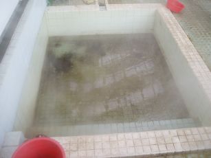 ・ドア向こうの浴場は現在物置の様子で使われていません。猫がいます。
