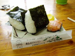 ・おにぎり2個入り450円(漬物・塩鮭含)はまずまず。