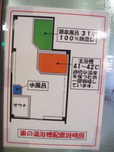 東の湯・・・加熱源泉風呂。源泉風呂。水風呂。サウナ。飲湯場。 |