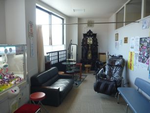 駐車場。ロビー。自販機。1F2F休憩室。 |